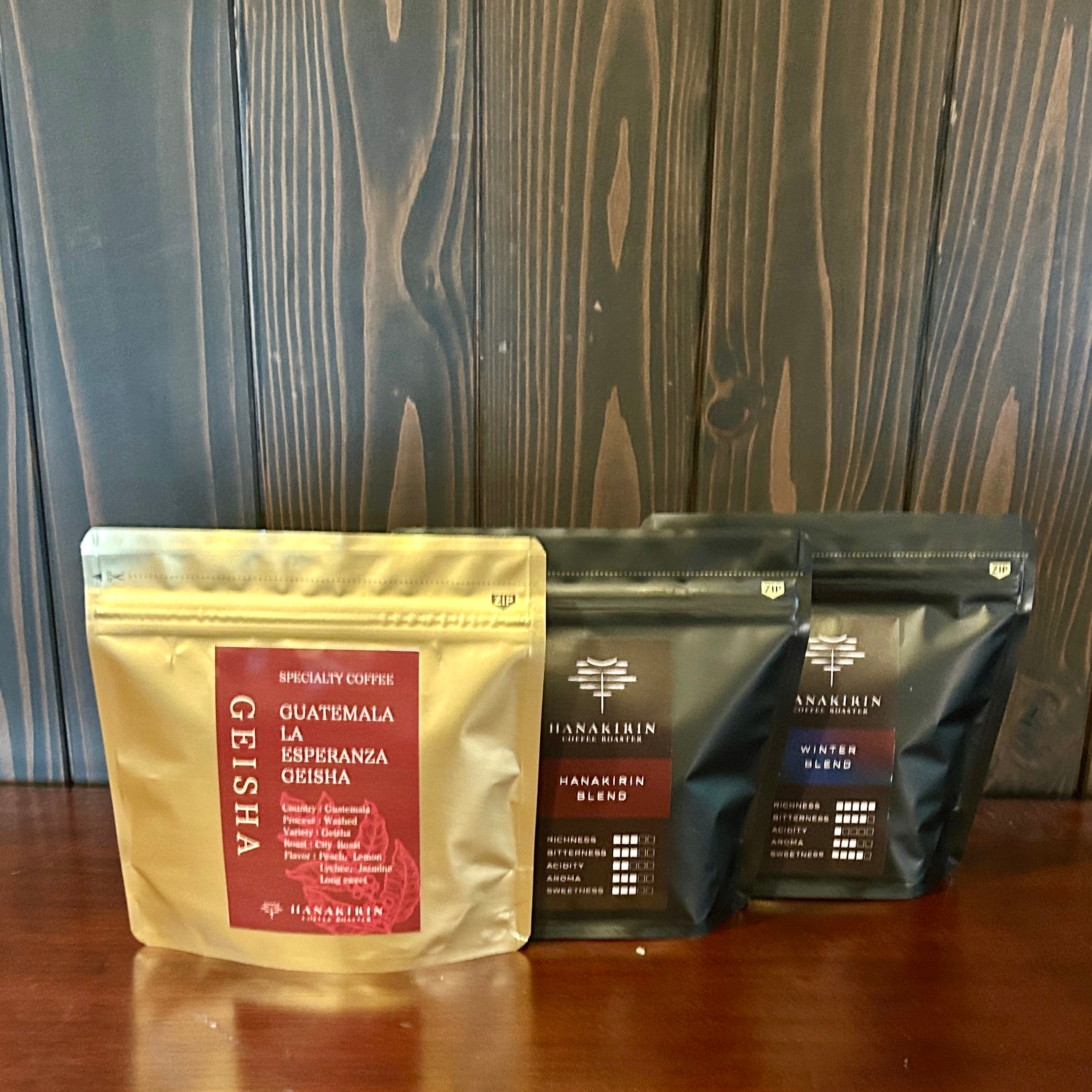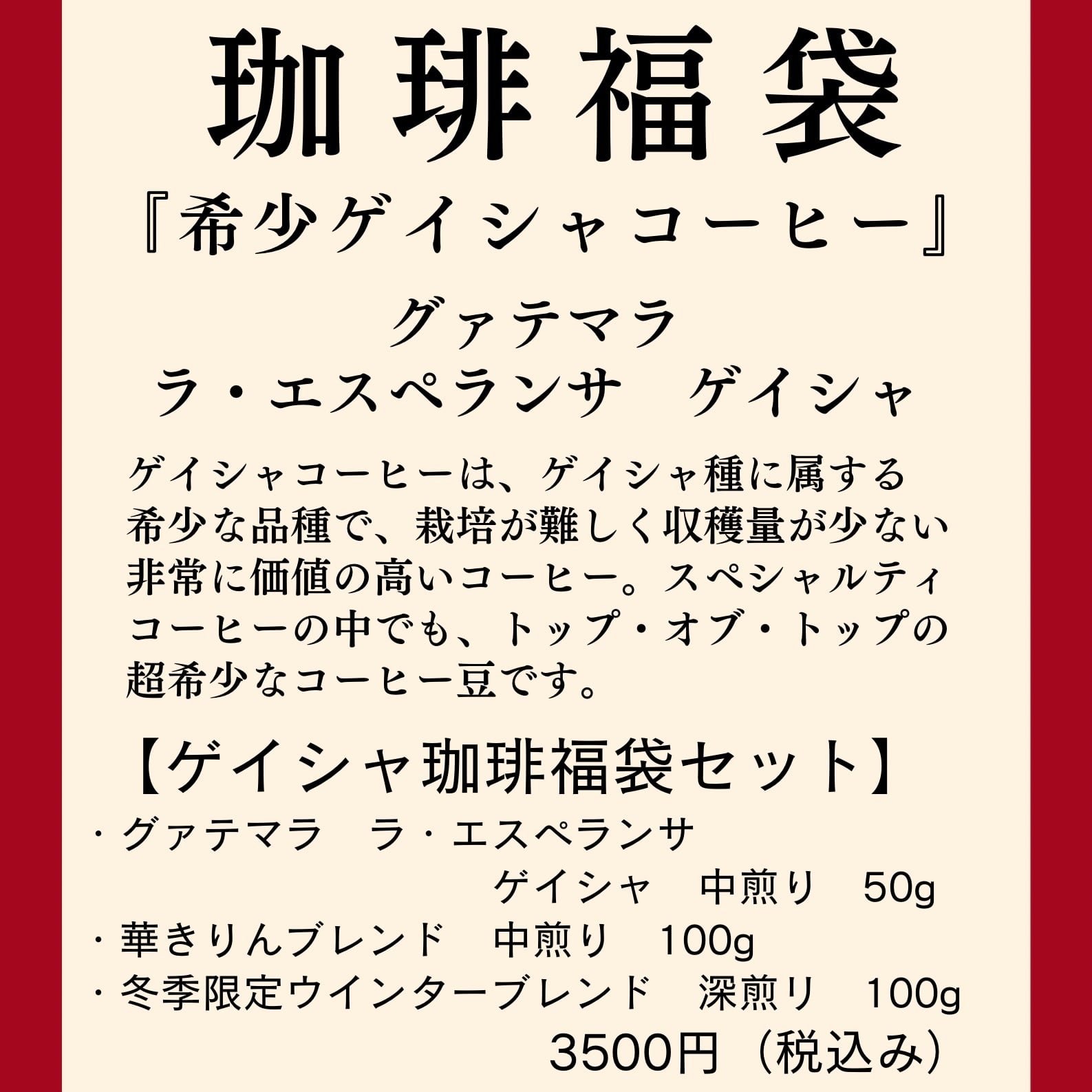希少ゲイシャゲイシャコーヒーと華きりんブレンド、冬季限定ウインターブレンドをセットにした珈琲福袋。